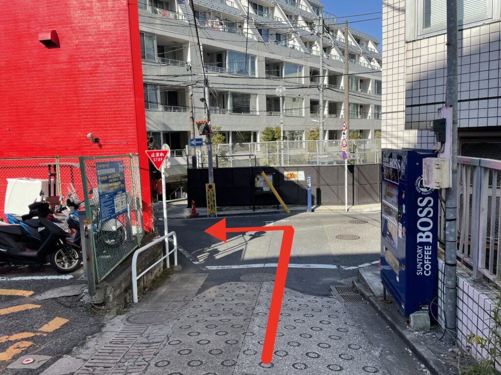 下り坂を下り、赤い建物を左に進みます。