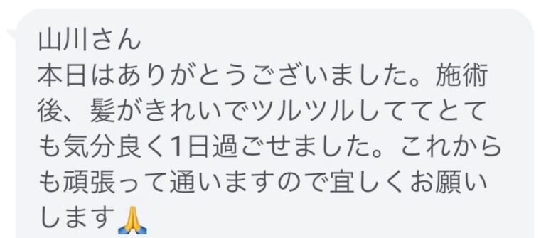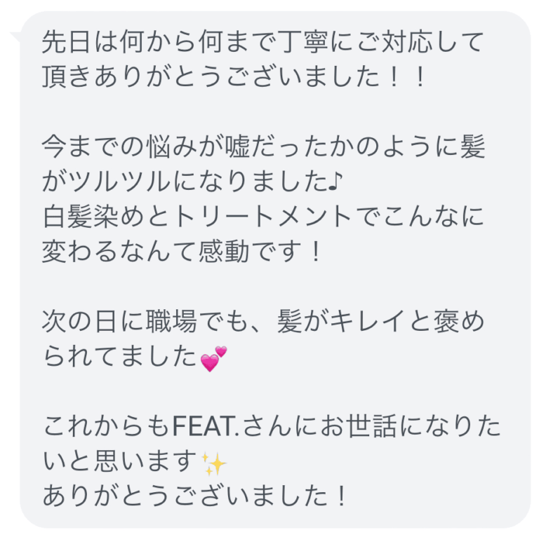 白髪染めの仕上がりが思っていた以上に素晴らしく、トリートメントもとても良かったです。これからもお世話になります!