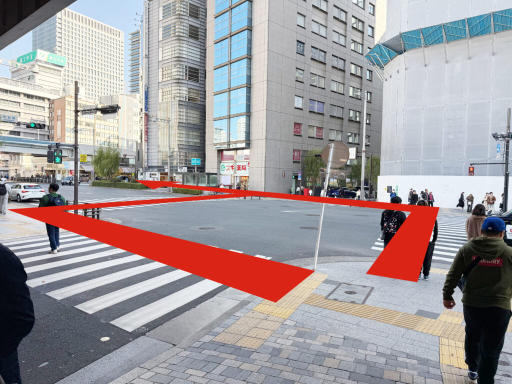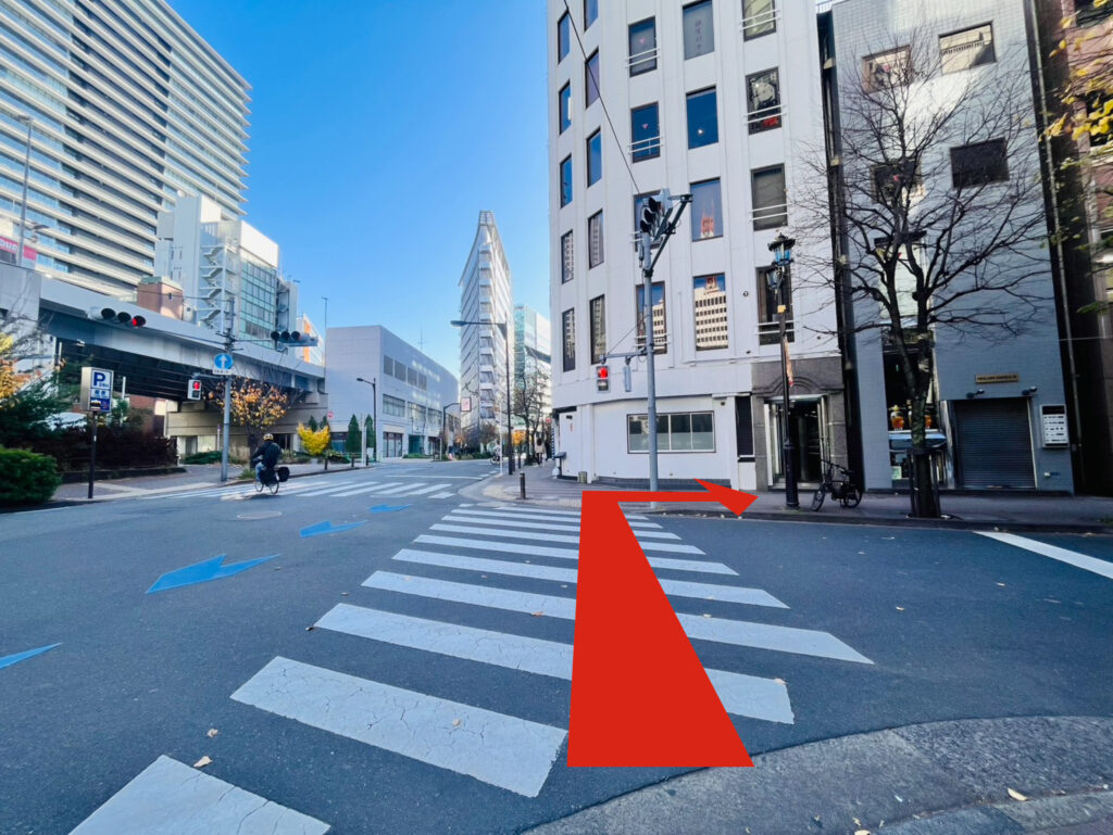 銀座INZ2とINZ3の間、高架をくぐりますと交差点にさしかかりますので、渡りまして奥の歩道 を左手に進みます。(薬局の前の歩道です)