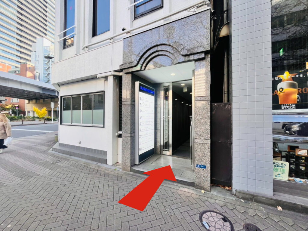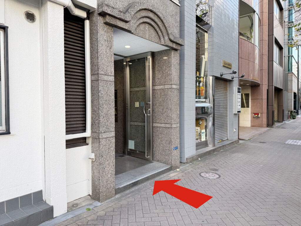 丁字路にさしかかります。角の建物の入口がございますのでこちらから入ります。4階に当店が ございます。