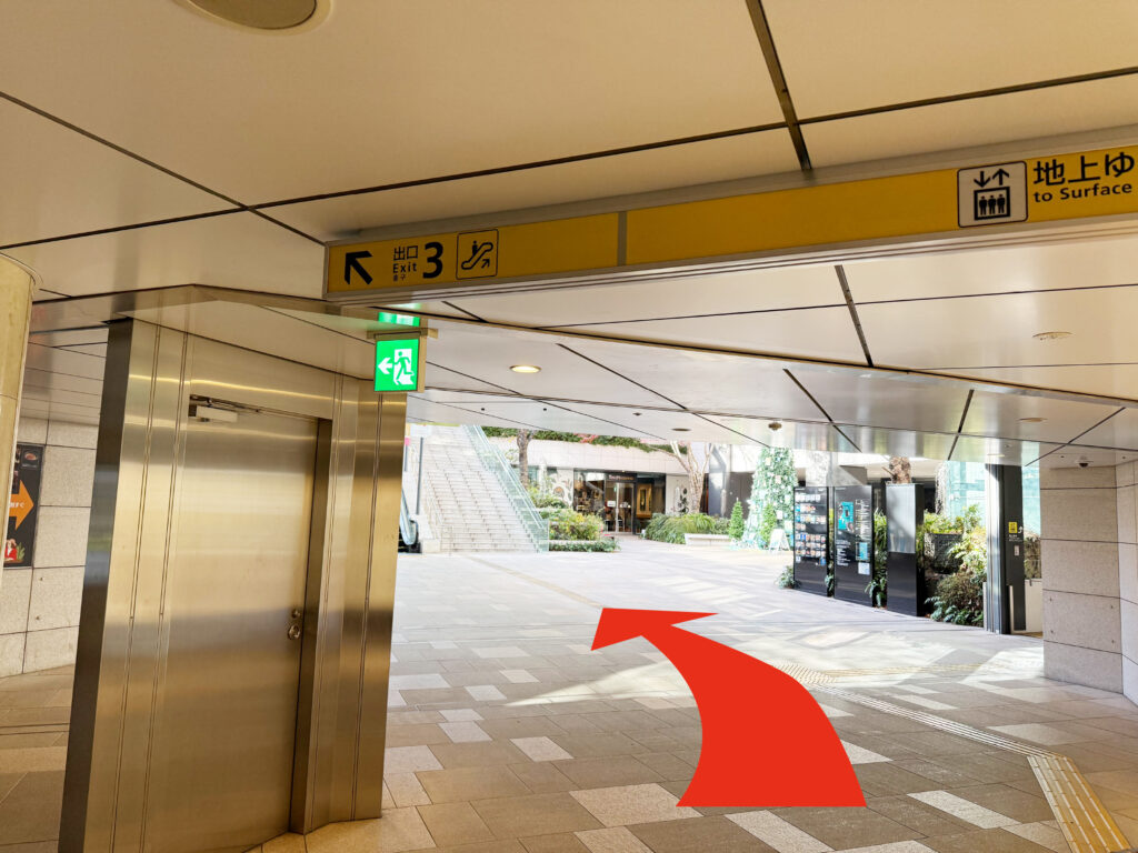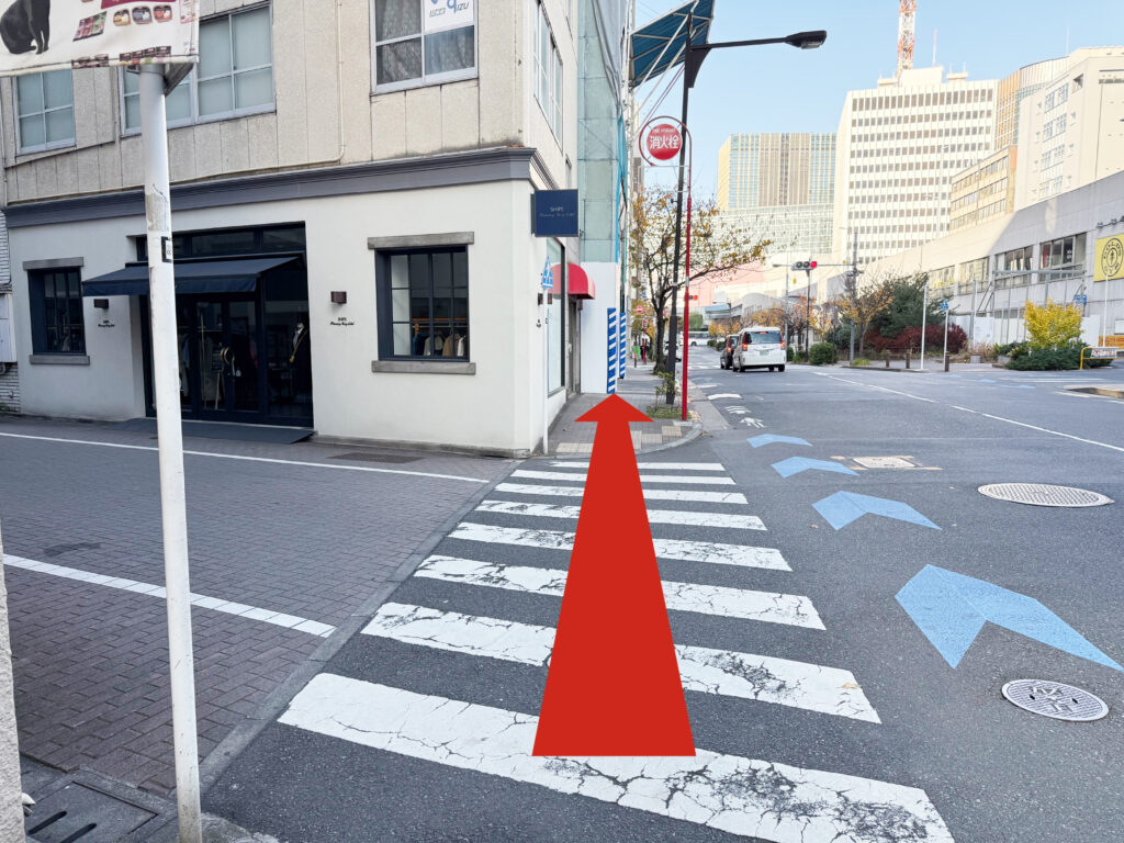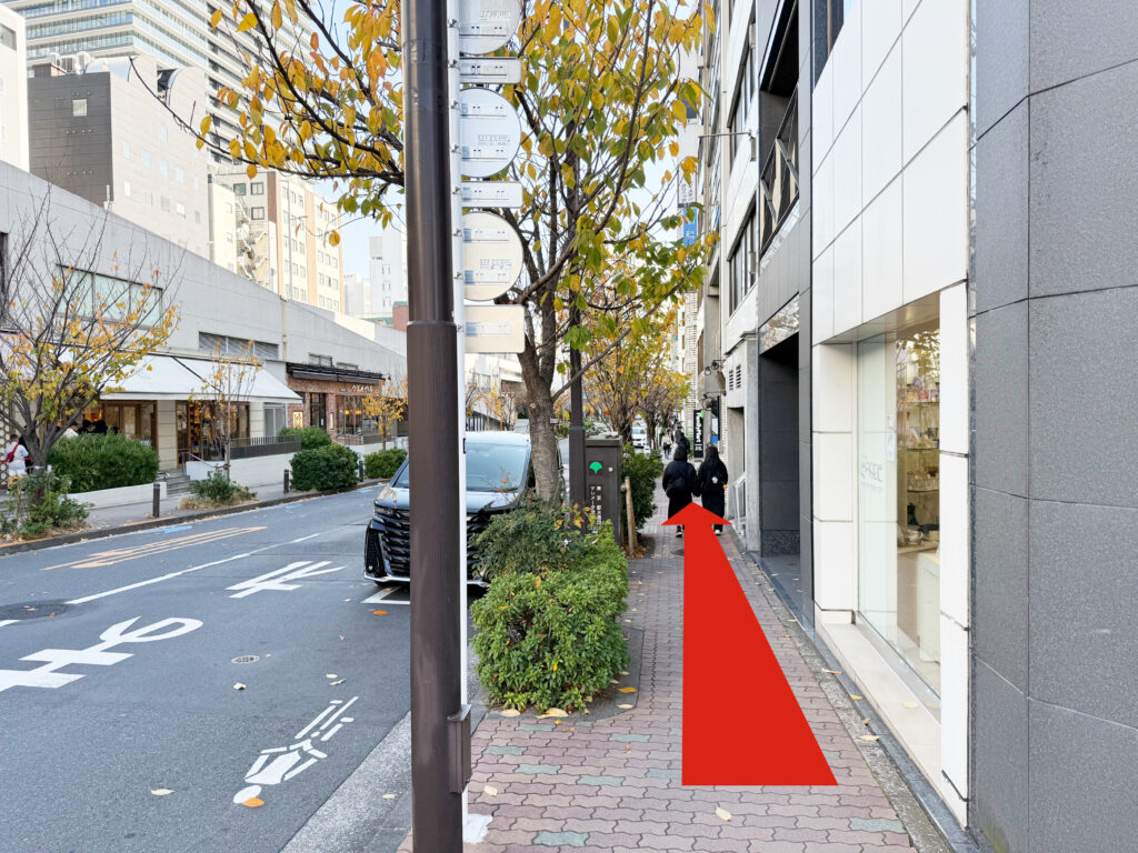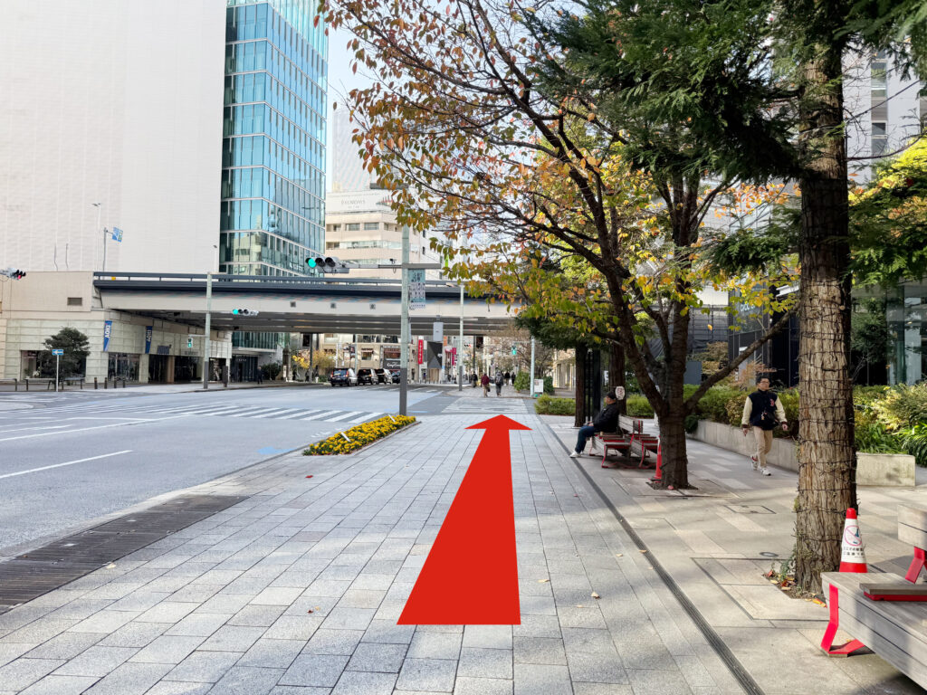 地上に出ましたら、すぐ左に歩道がありますのでそのまま向かって右手に真っ直ぐ進みます。