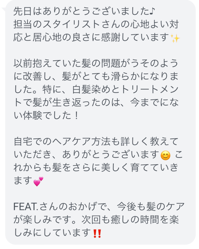 友人の勧めで初めて利用しましたが、リラックスできる空間と親切な対応が印象的でした。髪も柔らかくツヤが出て大満足です。