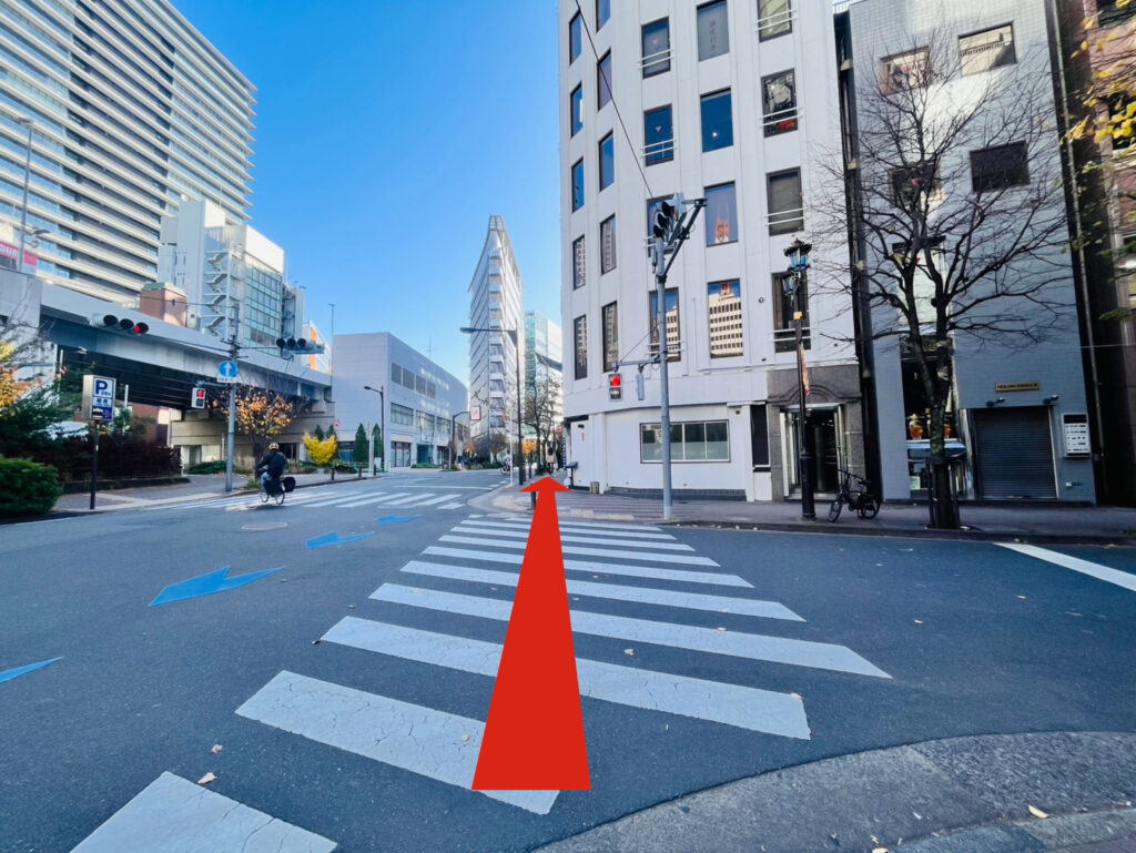 銀座INZ2とINZ3の間、高架をくぐりますと交差点にさしかかりますので、渡りまして奥の歩道 を左手に進みます。(薬局の前の歩道です)