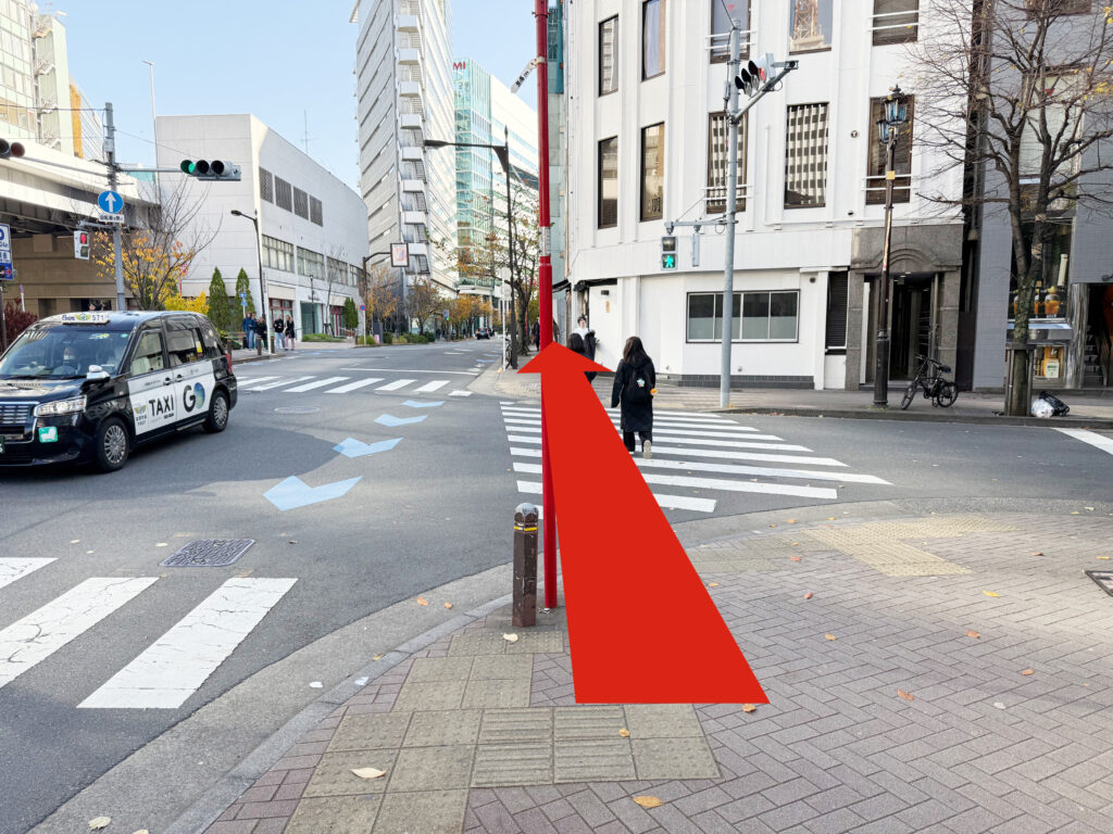 東京交通会館がございますので突き当たり左に曲がります。(北海道のアンテナショップが目 印です)